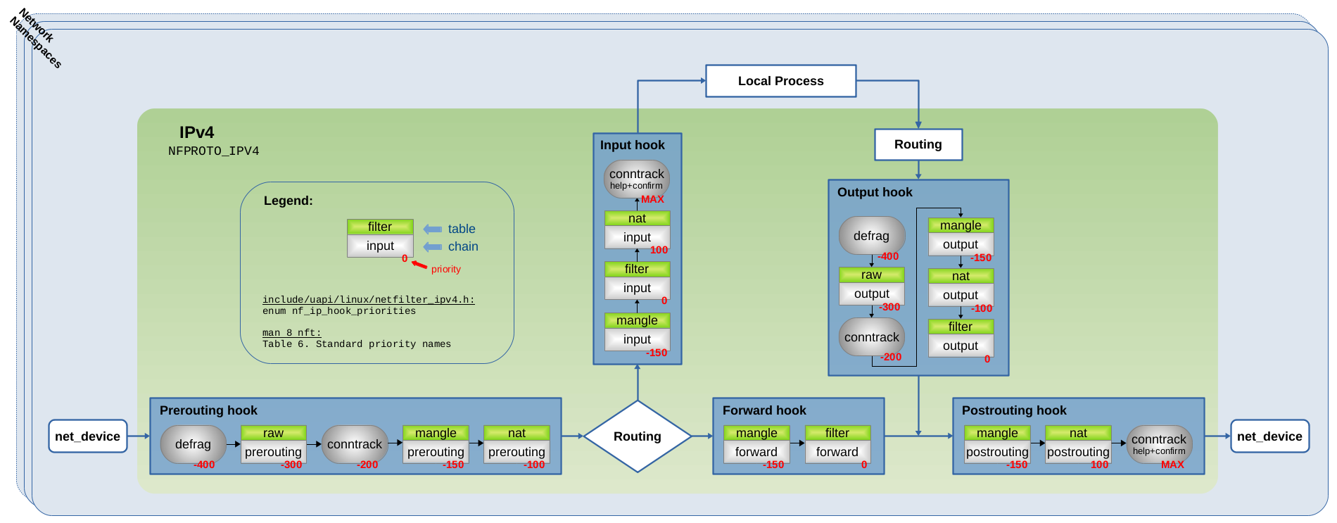 To put things into context let's do a short recap of what I already described in detail in the previous articles of this series: The ct system maintains all connections which it is tracking in a central table and each tracked connection is being represented by an instance of struct nf_conn. For each IPv4/IPv6 packet which is traversing the ct hook functions in the Netfilter hooks (the ones with priority -200; see Figure 1), the ct system determines to which tracked connection that packet belongs to and initializes a pointer within the skb data structure of the packet to point to the according instance of struct nf_conn. Thereby it marks/categorizes the packet, so other components like Iptables/Nftables can make decisions based on that. These concepts are often referred to as stateful packet filtering or stateful packet inspection. So far so good.