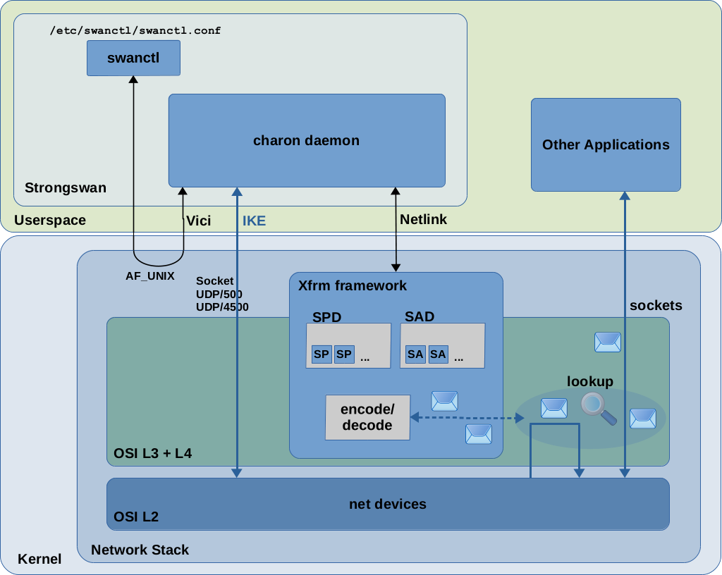 IPsec implementation in Linux consists of a userspace part and a kernel part. Several implementations have been created over the years. Nowadays the most commonly used implementation of the userspace part seems to be StrongSwan (There were/are other implementations like Openswan and FreeS/WAN. I'll focus on Strongswan here.) The IPsec implementation in modern Linux kernels is the so-called Xfrm framework, which is sometimes also called the Netkey stack. It is present in the Linux kernel since v2.6. There have been predecessors, like the KLIPS IPsec stack which was used in kernel v2.4 and earlier. With Figure 1 I like to show the responsibilities of Strongswan and the Xfrm framework and how both interact with each other in a simple block diagram style.