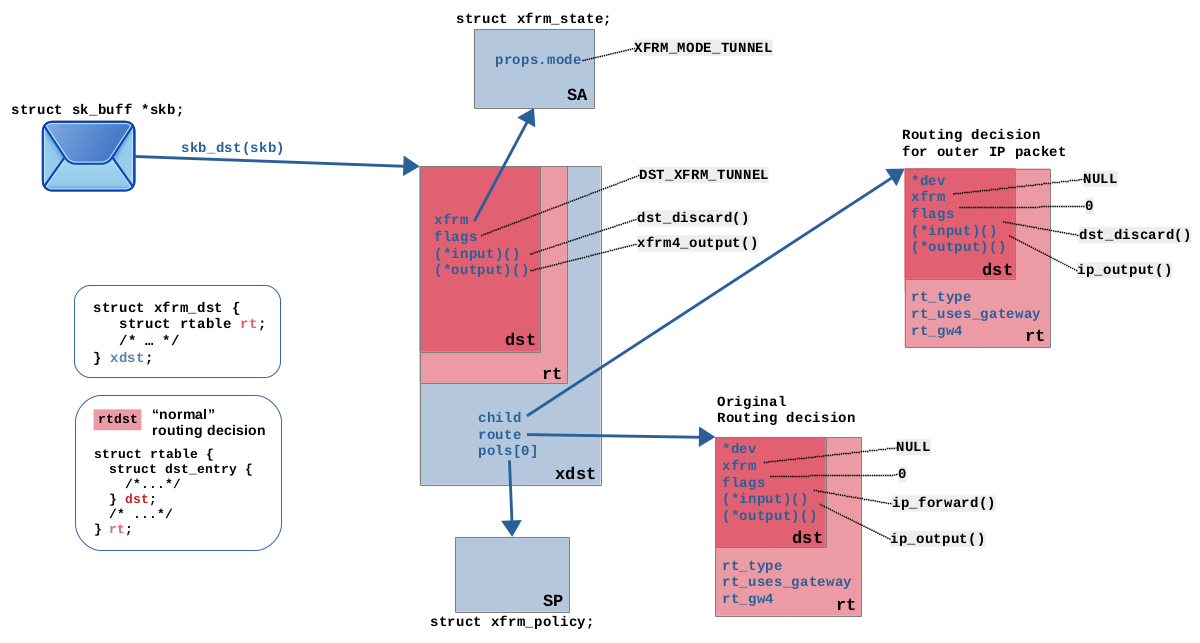 The routing lookup is performed for incoming as well as local outgoing packets, see Figure 2. Function fib_lookup() performs the actual lookup into the policy routing rules and routing tables. The routing decision resulting from this lookup is attached to the traversing network packet (skb). It is an instance of two combined structs, the outer struct rtable and the inner struct dst_entry, Together, both contain information like the output network interface, the ip address of the next hop gateway (if existing), function pointers which determine the path this packet takes through the remaining part of the kernel network stack, and more. My article series on routing explains that in detail. At first glance, routing has nothing to do with the Xfrm framework, but it is relevant in this context as you will see below.