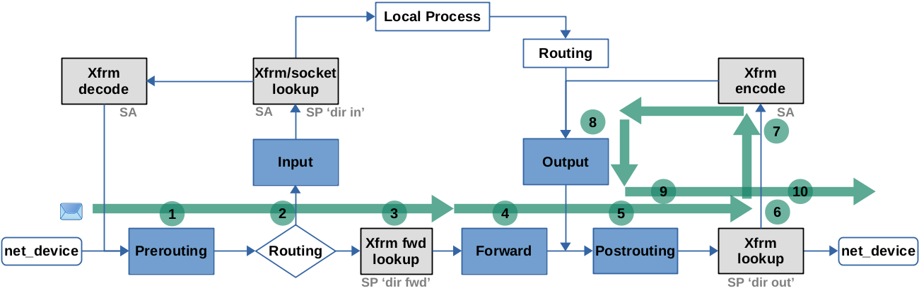 (Xfrm fwd lookup) This step is not shown in the Netfilter packet flow image (probably because it is considered less relevant), but I mention it here for completeness: If already decrypted+decapsulated packets arrive here, the SPD is used to check if they match to any “forward policy” (dir fwd SP) instance. If yes, they simply pass, if no they are dropped.