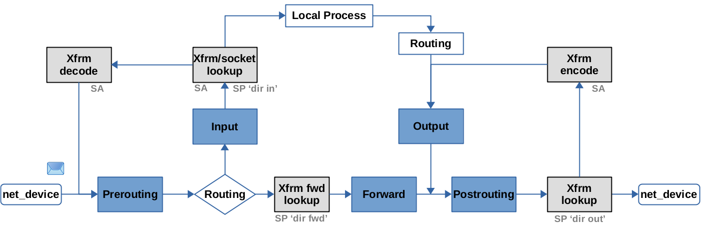 | Xfrm lookup | This is where the SPD is used to check if the traversing packets are matching to any “output policy” (dir out SP) and if yes, they are given to the Xfrm encode step to be encrypted+encapsulated |
