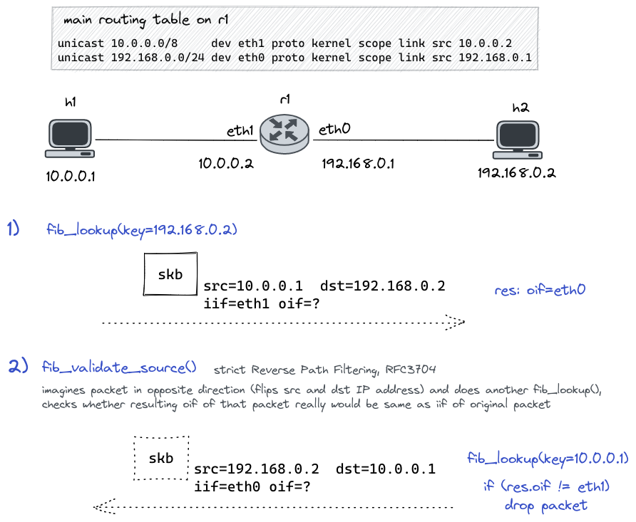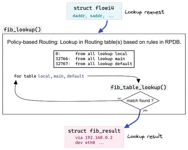 Function fib_lookup()2 is used here and implements the concept of Policy-based routing (PBR). Let's do a short recap on what that means: A so-called Routing policy database (RPDB) is implemented, which is a set of rules to be evaluated before the actual routing lookup.