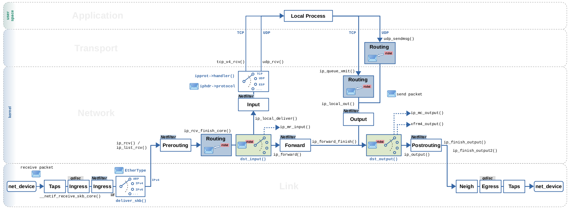 Of course, the routing subsystem of the Linux kernel is heavily optimized, as well for speed to achieve high packet throughput as for keeping memory consumption at economic levels. Further, it provides advanced routing features like policy based routing, virtual routing, multipath routing, sophisticated caching features, support for IPv4 and IPv6, support for multicast packets, features like receive path filtering, and so on and so on. As a consequence, once you start looking into details you'll realize that several of my statements above are blatant oversimplifications. The routing lookup is of course not actually performed for EVERY network packet and also not necessarily only in the two places shown in Figure 1. Further it is also not necessarily just based on the destination IP address of a packet. However, when reading kernel source code, it is very easy to get lost in the details of all those advanced routing features and optimizations and “not see the forest for the trees”. My intention in this article is not to try to “explain everything”, but instead to explain the path which common unicast IPv4 packets take through the network layer part of the kernel network stack as a result of the routing decision. This should give you a lifeline to hold on to while reading these parts of the kernel source code.