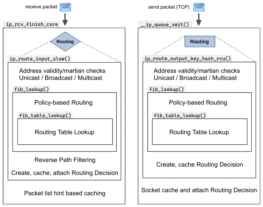 into the call stack, function ip_route_output_key_hash_rcu() is called, which performs several checks before and also after the actual lookup, which is done within function fib_lookup(), and also takes care about creating and caching the resulting routing decision. However, attaching that routing decision to the network packet is not done here in this case, but instead in the outer function __ip_queue_xmit().