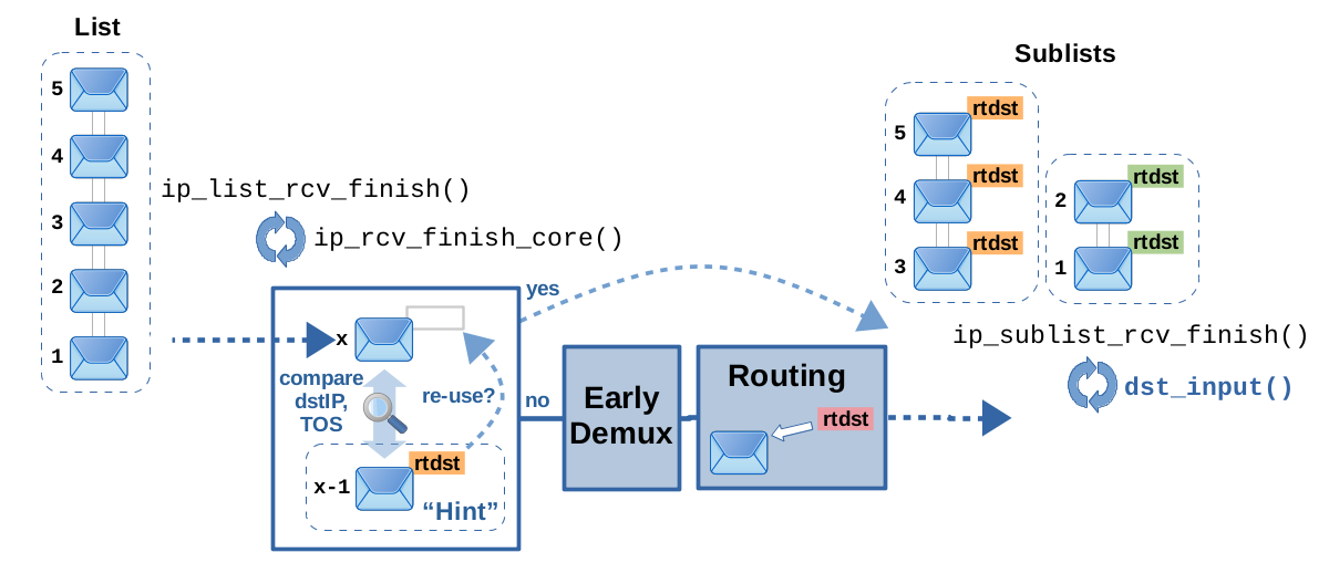 While ip_list_rcv_finish() is looping through the packets of its given list, it remembers the previously handled packet as hint for the next packet. As I said, it is quite likely that successive packets within the same list will get the same routing decision attached. So, when ip_rcv_finish_core() is called for the next packet, it gets the previous packet as hint and compares destination IP address and TOS value of both packets. If they are identical, the routing decision attached to the previous packet can simply be re-used for the next packet. Thereby, the early demux and the actual routing lookup can be skipped this this case, which results in a runtime speed-up. However, there are limitations to this feature. A check in ip_list_rcv_finish(), done by function ip_extract_route_hint(), prevents the hint from being used for broadcast packets and in case non-default policy-based routing rules are present. Remember, while this is not the case for the default rules, “real” policy-based routing rules can actually select a different routing table for lookup, based on parameters like the packet's source IP address, the skb->mark and so on. Thereby, you cannot simply re-use the routing decision of the previous packet in this case, just based on it having the same destination IP address and TOS value.