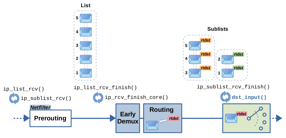 After traversal of the Netfilter Prerouting hook, function ip_list_rcv_finish() is called and is given a list of packets. This function loops through the packets in the list and calls ip_rcv_finish_core() for each packet. The latter function contains the early demux feature and the full-blown routing lookup, which includes the nexthop exception and nexthop caching features explained above. While looping through the packets, ip_list_rcv_finish() groups them into sublists, based on the attached routing decision; meaning, successive packets which got the same routing decision attached, end up in the same sublist. In general it is quite likely that packets which are received in a burst directly one after another, turn out to have the same source and destination and thereby the same resulting routing decision attached. Thus, this grouping makes sense. Those sublists are then one by one fed into function ip_sublist_rcv_finish(), which loops through the packets of the given sublist and calls dst_input() for each packet. Ok, so far so good. Now let's get to this optimization feature; see Figure 14.
