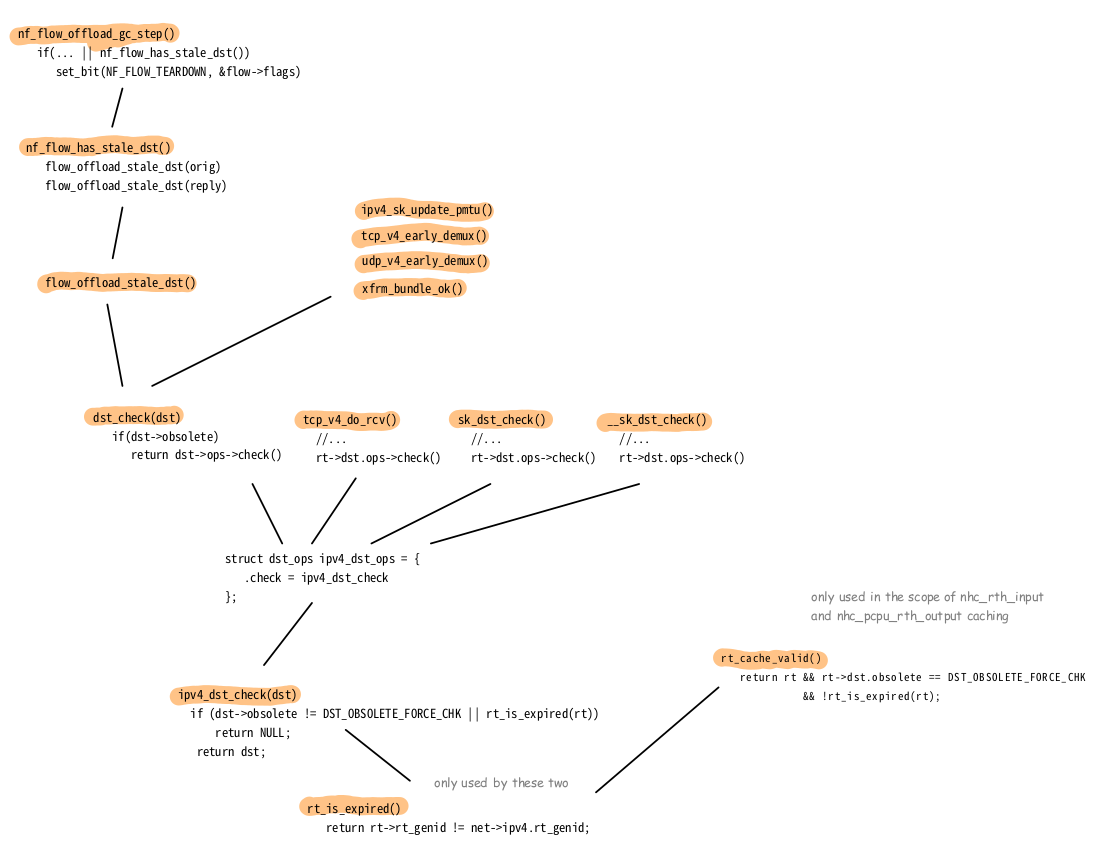 You can see, that if obsolete contains another value, then rt_is_expired() would not be called, but this instance would then anyway be considered expired. There are many more functions which all end up calling rt_is_expired(). Figure 15 shows several ones; no guarantee for completeness. You'll probably recognize these calls originating from several of the caching and optimization features described above, like the socket-based caching, early-demux and flowtables.
