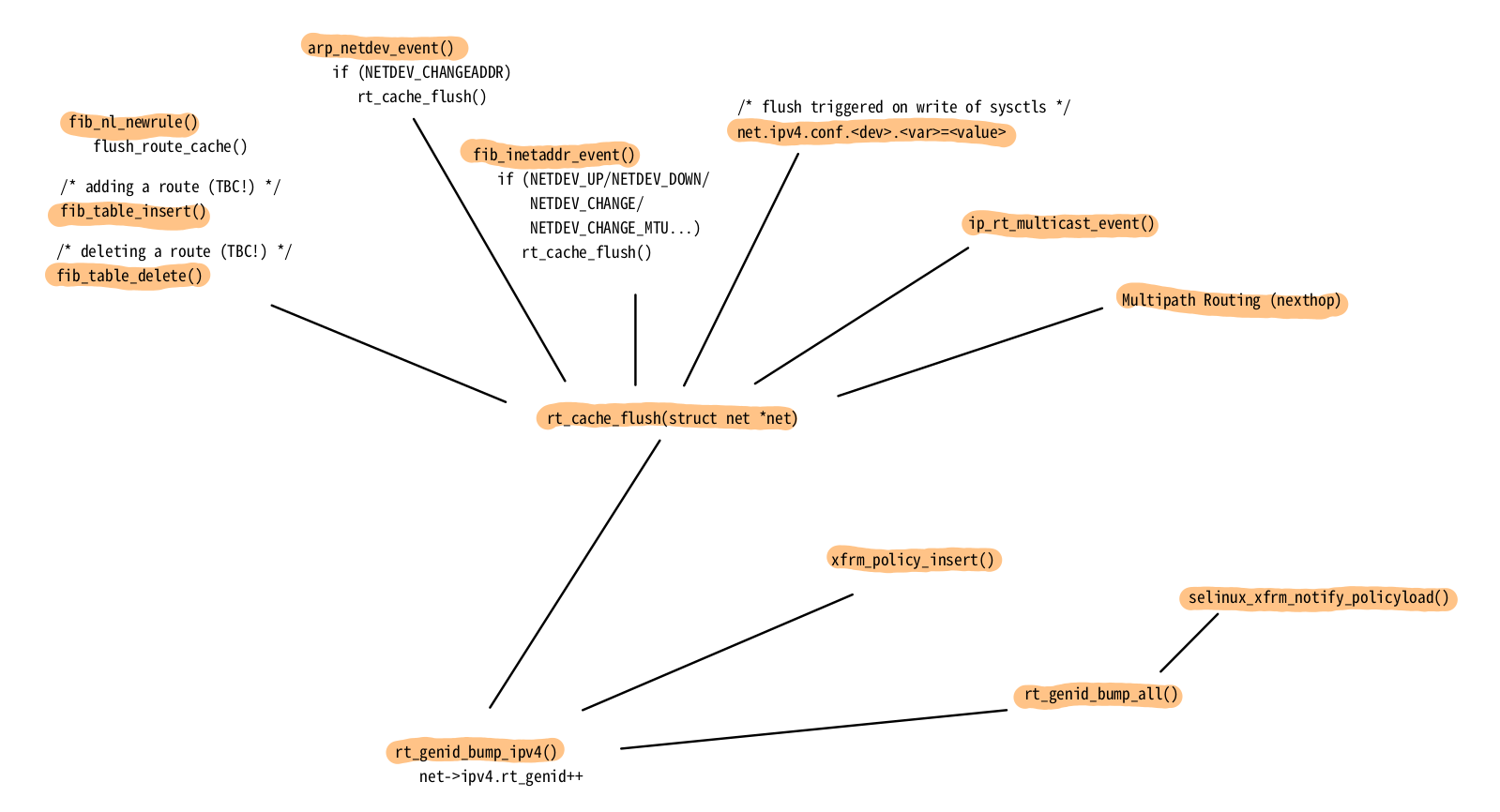 There are many events which call rt_genid_bump_ipv4() and thereby invalidate all currently cached routing decisions. Figure 16 shows several ones; no guarantee for completeness. Examples are content changes in the routing table(s), MAC address changes, network device configuration and status (up/down) changes, writes to network stack related sysctls, IPsec (xfrm) policy changes, and so on.