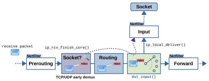 There is yet another Socket-based caching feature. However, this one is only present in modern kernels. It is also referred to as IP early demultiplexing and is targeted at network packets on the receive path, which will end up to be received by a local TCP/UDP socket on the system; see Figure 12.