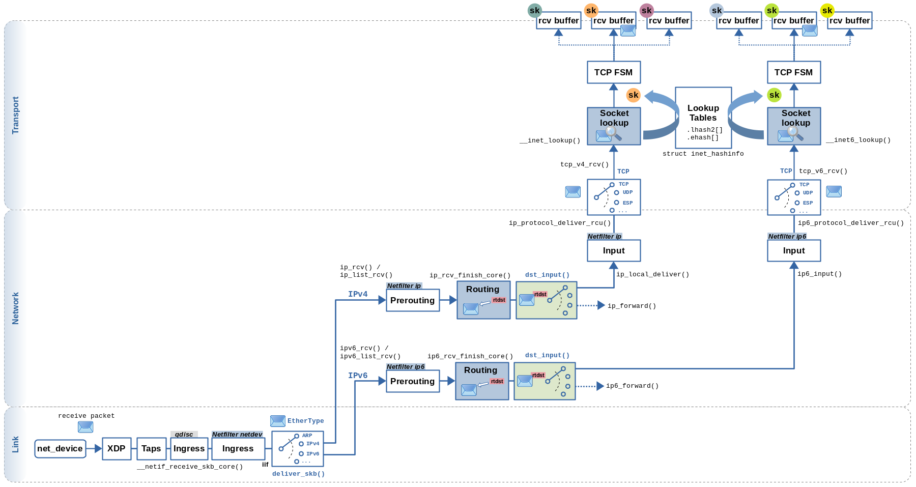In this 3rd article of the series, I like to dive into the socket lookup for TCP packets, which determines the socket on which an incoming TCP packet will actually be received and handled. While separate receive paths exist for IPv4 and for IPv6 packets, the socket lookup and the implementation of the TCP protocol both primarily consist of shared components which are being used on both receive paths. The overall way the lookup works is kept nearly identical in both cases. I'll walk through the general packet flow, the involved components like the socket structs, the hash tables, and finally the socket lookup itself.