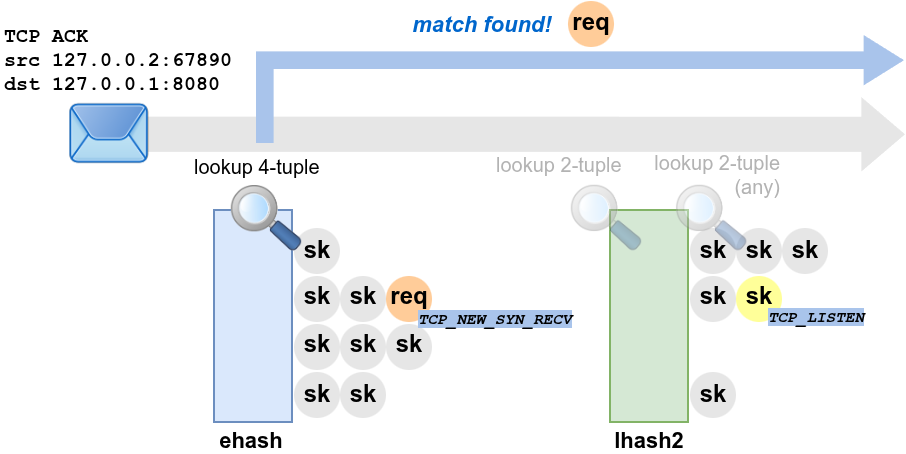 Let's assume now a TCP ACK is received from the same client, which completes the TCP 3-way handshake. The request socket and our original listening socket are both present in the hash tables as shown in Figure 16. The TCP socket lookup finds our request socket in the ehash table based on the packet's 4-tuple21) and thereby detects that the received TCP ACK packet is part of an ongoing connection request.