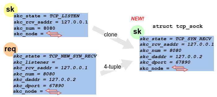 Most of the packet handling which follows now is done in function tcp_check_req() and functions below that. Further checks are done and if the packet turns out to be valid, a new full-blown TCP socket instance is created, which shall represent the established TCP connection. This new instance of struct tcp_sock is being cloned from our listening socket. Cloning here means, that most of the internal member variables are being copied to the new instance. Fittingly, this new socket is usually referred to as a child socket (a child of the listening socket). However, certain variables like the 4-tuple are being copied from our request socket. See Figure 17. The state of this new socket is initially set to TCP_SYN_RECV.