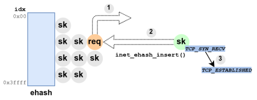 In other words, the lookup into ehash can find a matching socket which represents a TCP connection which is either established or is currently in the middle of the TCP 3-way handshake or the