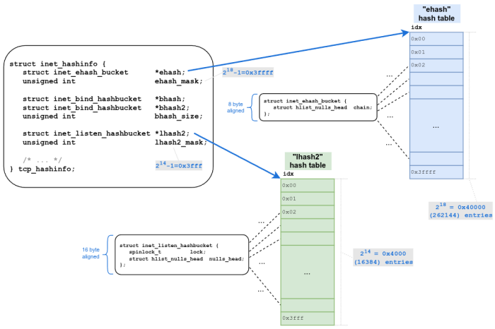 __inet_lookup_skb() or __inet6_lookup_skb() being called here, which do first call inet_steal_sock() or inet6_steal_sock() respectively. However, that's only relevant regarding the early-demux feature. I do not focus on that here.bhash and bhash2 in this way:$ journalctl -b 0 -k -g 'TCP bind' TCP bind hash table entries: 65536 (order: 9, 2097152 bytes, linear) # meaning: # 65536 buckets in *bhash a 16 byte # 65536 buckets in *bhash2 a 16 byte # 65536 * 32byte = 2097152 byte