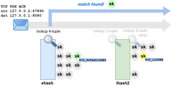 Now, a lookup into lhash2 is done based on the 2-tuple, consisting of the dstIP and dstPort of the received packet. A hash is calculated based on the 2-tuple and the netns to determine the bucket/slot and then the code uses function inet_lhash2_lookup() to loop through the sockets of the linked list of that bucket/slot. This lookup is able to find a matching listening socket which is bound to a specific local IP address and port. If no match is found, another lookup is done into lhash2, this time based on a 2-tuple consisting of the “any” IP address 0.0.0.0 and the dstPort of the received packet. Obviously, this lookup is able to find a matching listening socket which is bound to the “any” IP address and a specific port. From the sequence of lookups performed here you can clearly see that matching sockets which represent actual TCP connections based on the 4-tuple take precedence over matches to listening sockets bound to specific addresses which in turn take precedence over matches to listening sockets bound to the “any” address.
