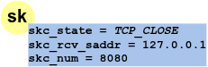 The bind(2) syscall, primarily represented by function inet_bind() in the kernel (in case of IPv4), here binds the socket to 127.0.0.1:8080 and saves this IP address in member variable skc_rcv_saddr and the port 8080 in member variable skc_num.