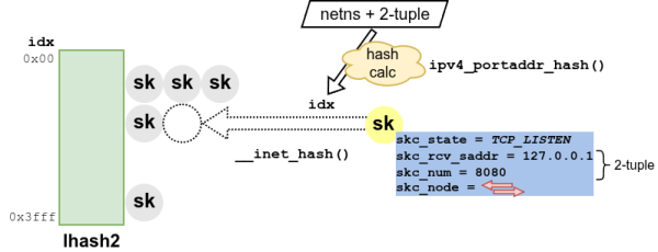 This marks our socket as “passive” = it makes the socket listening on the bound local address and port for incoming TCP connections from other “active” sockets (clients). It does that by adding the socket to table lhash2 and setting its state to TCP_LISTEN. The hash, which is used as index in lhash2, is being calculated by function ipv4_portaddr_hash()18) based on the network namespace and the 2-tuple of the bind address and port. The connector pointers skc_node19) are used to add it to the linked list of the correct bucket of the table, see Figure 11.