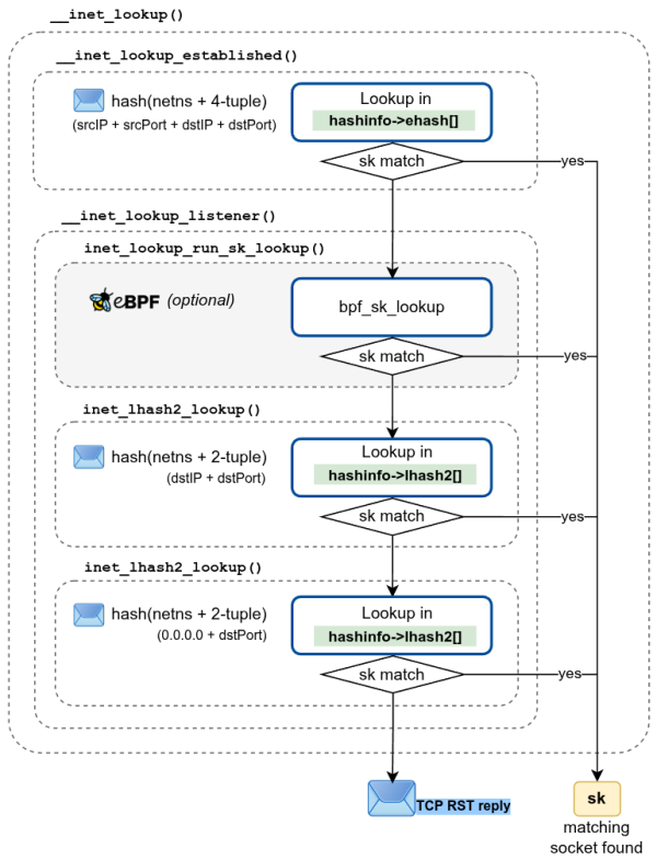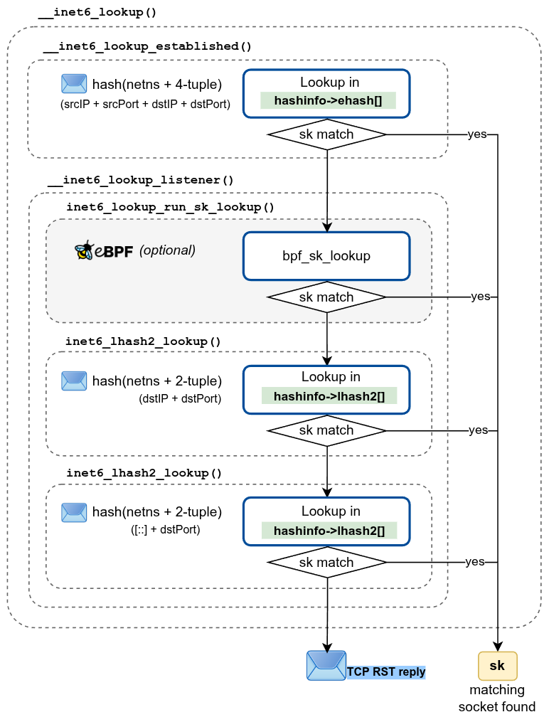 by function inet_match(). Here the socket member variables sk_net, skc_rcv_saddr, skc_num, skc_daddr and skc_dport are used for comparison, see again Figure 2. If a matching socket is found, the whole lookup finishes here. Else the code proceeds to the lookups into lhash2. As indicated in Figure 7, there is an optional eBPF lookup happening in between here, see inet_lookup_run_sk_lookup(). By default, this is a no-op and you can ignore it. See the info box below for more details on this optional lookup.