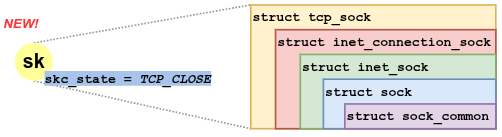 Please be aware that those member variables are frequently being accessed under several different alias names instead of their actual name when being used in different parts of the code. Most of the structs in this hierarchy got a bunch of preprocessor defines which serve as alias names or “shortcuts” to access member variables of the structs which are lower in the hierarchy. See e.g. this list of defines which is part of struct sock. In this article I'll always use the actual name and not one of these alias names when referring to a member variable.