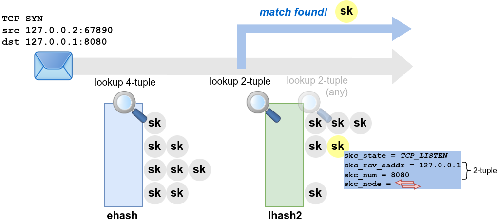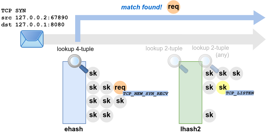 Let's say a TCP SYN packet is received from a client and it matches to the listening TCP socket which we just created. The TCP socket lookup doesn't find a match among the sockets in the ehash table, but it finds our matching socket in the lhash2 table, see Figure 12.