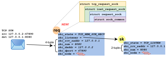 Thereby we detected a new connection request, and a new “request socket” is being created. For IPv4 this is a socket of type struct tcp_request_sock. See Figure 13. Figure 4 above shows its internal structure in detail. Its purpose is to serve as a “lightweight” socket which represents the detected (and now ongoing) connection request. The 4-tuple consisting of srcIP:srcPort + dstIP:dstPort of the received TCP SYN packet is saved in its member variables. It's state is set to TCP_NEW_SYN_RECV. Member skc_listener is made to point to our listening socket, to which the socket lookup for the packet matched.