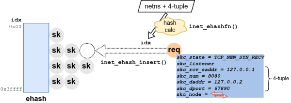 At this point the request socket and our original listening socket are both present in the hash tables as shown in Figure 15. The TCP socket lookup finds our request socket in the ehash table based on the packet's 4-tuple + netns and thereby detects that the received packet is part of an ongoing connection request.