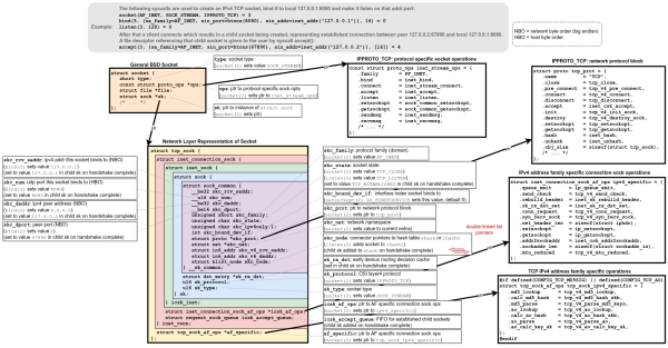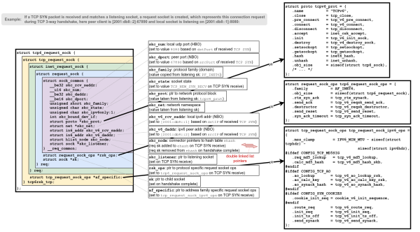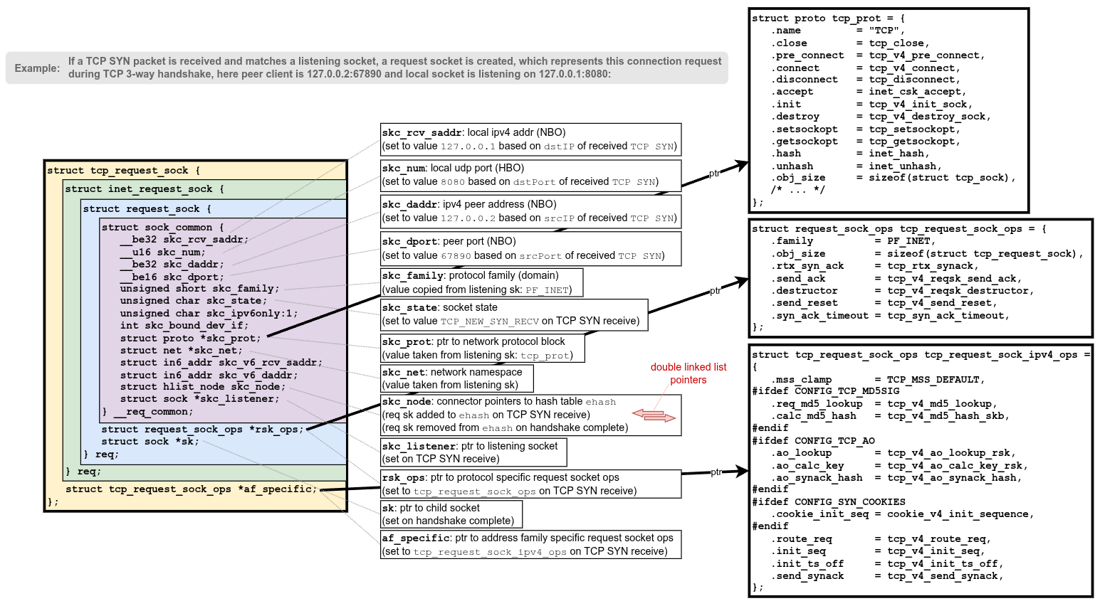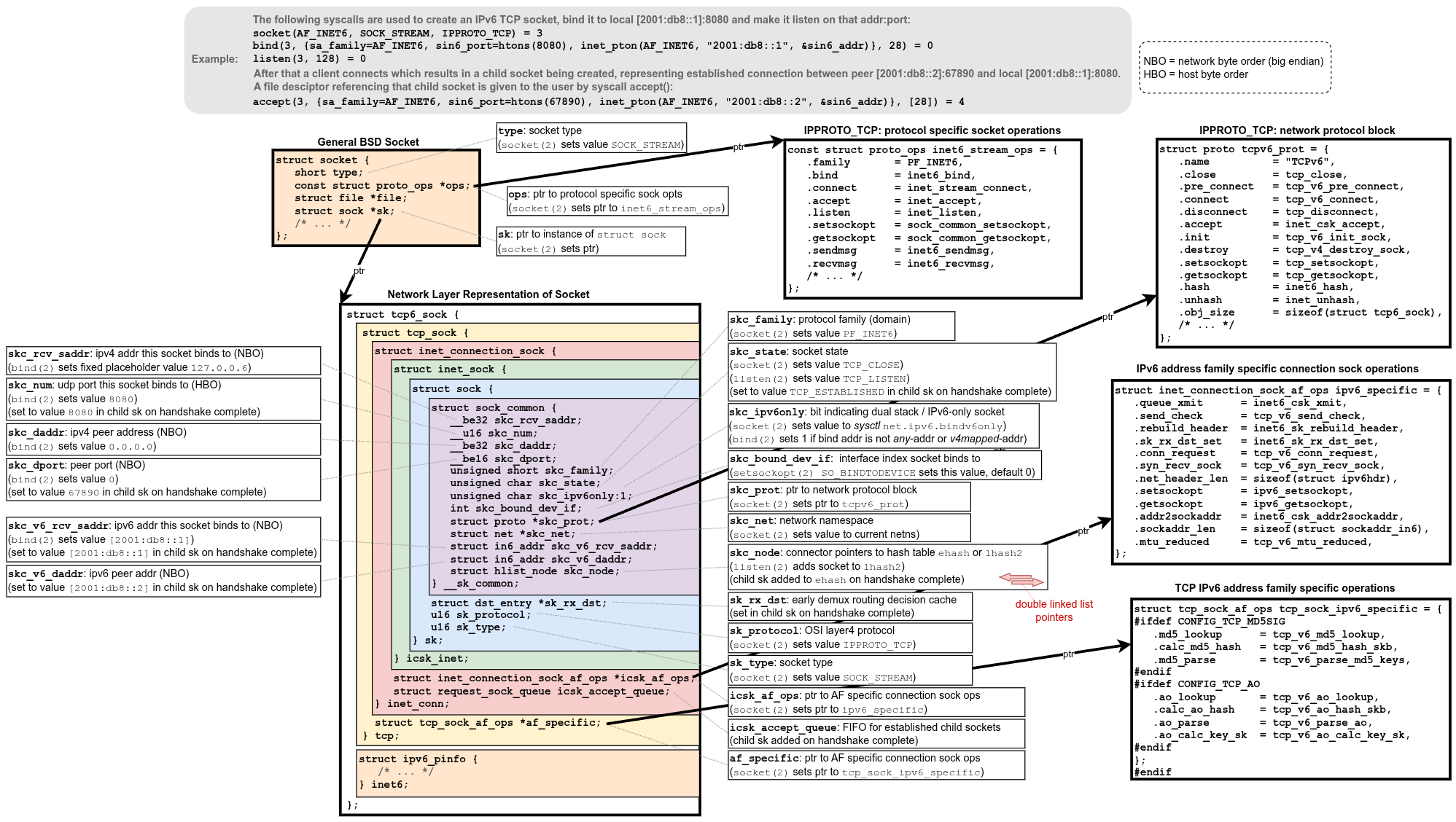 Figure 2 shows the instances of structs which are allocated and initialized in the kernel when you use the socket(2) syscall to create yourself a TCP socket in the domain of IPv4, then use the bind(2) syscall to bind this socket to a local IPv4 address and port and then use the listen(2) syscall to make this socket listen on the bound address and port.