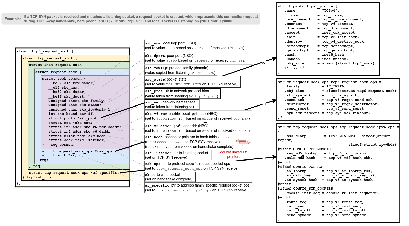 In case of IPv6 it consists of the exact same hierarchy of structs, just the whole thing is being wrapped into an instance of struct tcp6_request_sock at its top, see Figure 5.