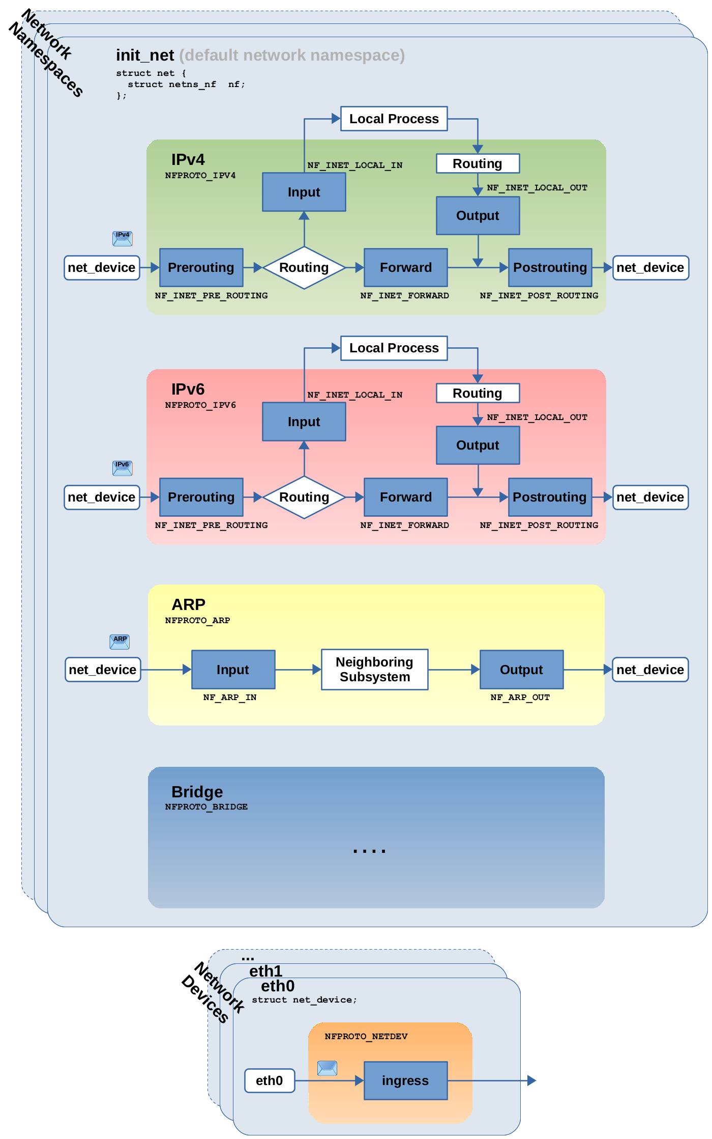 Those five hooks have been present in the Linux kernel for a very long time. You can e.g. already find an equivalent of Figure 2 in the Linux netfilter Hacking HOWTO from 2002. The good news is that at least from a bird's eye view all this is still accurate today. Of course, if you look into details, things are more complex now. I try to show that in Figure 3. The courier font within the image indicates how things are named within the Linux kernel source code.