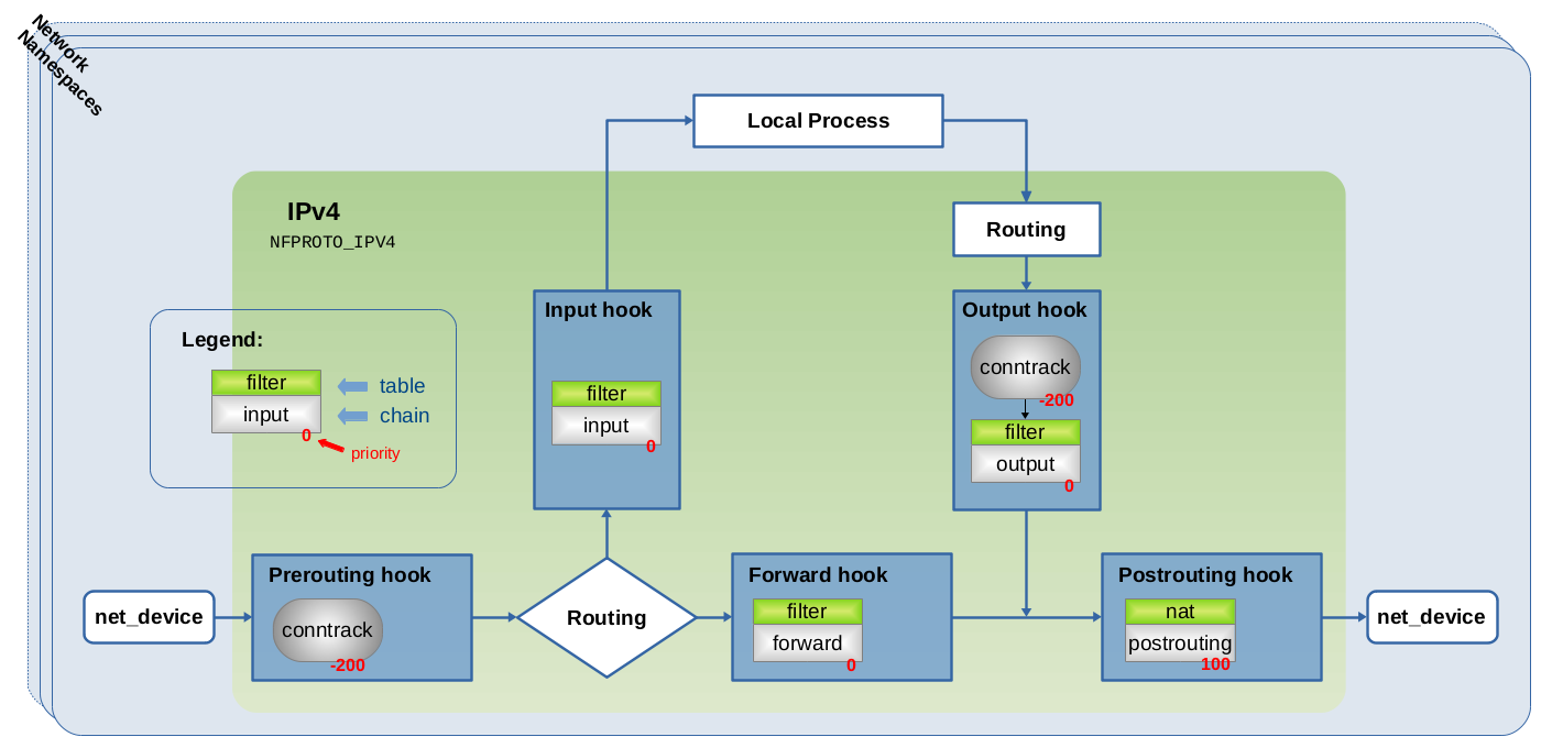 I for myself always like to know how things work and to dig a little deeper than just gaining the very minimum knowledge required to solve the issue at hand. Available documentation on this topic isn't bad, but like most other documentation it tends to leave some gaps and questions in your head unanswered and a lot of the available documentation is outdated. Many of the more interesting details are often only covered by older articles focused on the Nftables predecessor Iptables. After digging through a lot of websites, some kernel source code and doing some practical experimenting involving the trace and log features of Nftables, I like to share some things I've learned. With this article I'll try to explain Nftables concepts like base chains, priority and address families and put them in relation to the actual network packet flow through the Netfilter hooks.